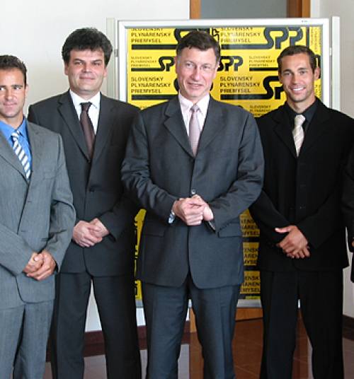Tibor Soós, tréner slovenského štvorkajaka s posádkou Richard a Michal Riszdorferovci, Erik Vlček a Juraj Bača a predseda predstavenstva Slovenského plynárenského priemyslu a.s. (SPP) Philippe Boucly podpísali v pondelok v budove ústredia SPP v Bratislave zmluvu o reklame, ktorá zabezpečí štvornásobným majstrom sveta 1,5 milióna korún. "Slovenskí rýchlostní kanoisti sú príkladom pozitívneho zviditeľňovania Slovenska. Súhra štvorkajaka je výborným príkladom aj pre bežný život. Dokazuje, že vyhrať môžeme iba vtedy, ak budeme všetci spolupracovať. Tešíme sa z možnosti pomôcť výnimočným športovcom v príprave na blížiace sa olympijské hry. Želáme im úspech, veríme, že z Atén prinesú medailu," povedal po podpise zmluvy Philippe Boucly. "Máme radosť, že sa značka SPP spojila s menom najúspešnejšieho športového kolektívu Slovenska v minulom roku. Táto spolupráca bude osožná pre všetkých. Som rád, že SPP sa rozhodol prispieť výnimočným športovcom. Vďaka ich prispeniu si budeme môcť dovoliť prípravu porovnateľnú s našimi najvážnejšími súpermi," neskrýval radosť Tibor Soós. "Doteraz sme sa pripravovali vďaka peniazom zo Slovenského olympijského výboru, teraz si budeme môcť dovoliť vyšší štandard. Kvalita pôjde hore a to je dobre," pridal sa Juraj Bača. "Veľká časť týchto peňazí pôjde na kúpu novej lode v Poľsku. Verím, že ju ešte stihnú do olympiády vyrobiť. Boli by sme radi, keby sme spoluprácu s SPP predĺžili aj na ďalšie roky," vysvetlil použitie financií T. Soós. "Uvidíme. Ak na olympiáde príde úspech, nebudeme sa brániť ďalšej spolupráci," zakontroval predseda predstavenstva SPP a.s. Slovenský štvorkajak si na aktuálnu sezónu okrem olympiády naplánoval jediný štart na medzinárodnej scéne. Od 18. do 20. júna sa predstaví na pretekoch 1. kola Svetového pohára v českých Račiciach.