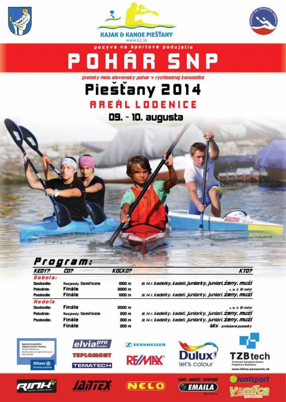 Areál piešťanskej lodenice na Sĺňave už čoskoro privíta rýchlostných kanoistov z celého Slovenska. Najlepší síce budú bojovať v tom istom čase na MS v Moskve, no inak príde do Piešťan to najlepšie, čo doma máme. Vo všetkých kategóriách od najmladších detí. Pohár SNP je súčasťou série pretekov Nelo Slovenský pohár.