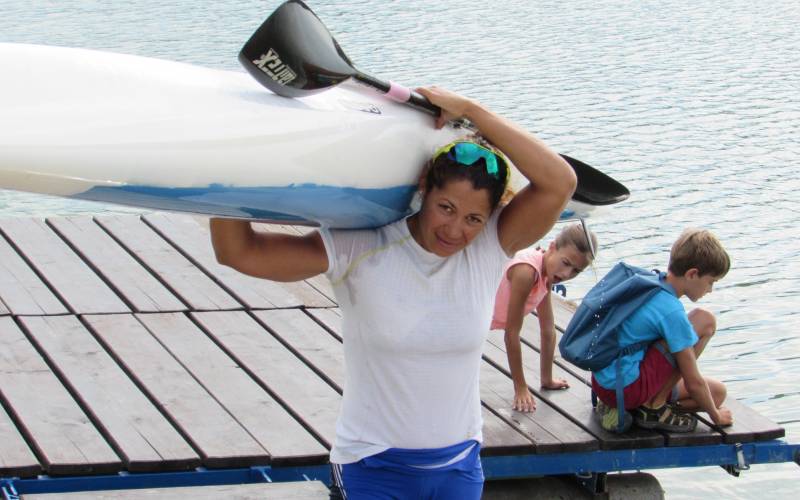 Martina pripádluje k mólu, vystúpi z vody a nacvičeným pohybom si svoju loď elegantne prehodí cez plecia. Má za sebou 45 minút tréningovej rozcvičky.