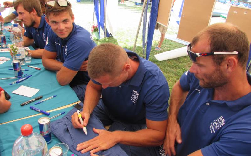 Okrem podpisových kartičiek dali svoje autogramy na tričká, šiltovky, kraťasy... Skupinka mladých vodákov z kajakárskeho klubu Slavia UK Bratislava dokonca dovliekla do stanu loď, na ktorú si vypýtala podpisy členov štvorkajaku.